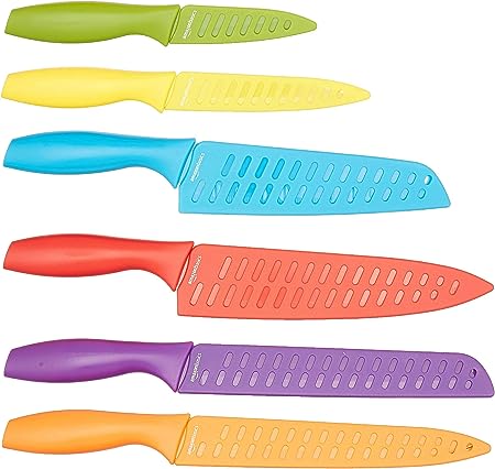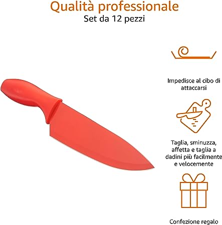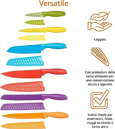 Il set di 12 coltelli colorati è formato da 6 coltelli e 6 custodie proteggi lama abbinate; i coltelli includono: coltello da cucina, coltello taglierino, coltello Santoku, coltello da intaglio, coltello da chef e coltello da pane Le lame durevoli in acciaio inossidabile rimangono affilate a lungo, per un uso sicuro ed efficiente. Speciale sistema di codificazione basato sui colori per una veloce identificazione del coltello e per ridurre il rischio di contaminazione incrociata durante la preparazione del cibo. Il rivestimento antiaderente colorato impedisce al cibo di attaccarsi alla lama, per un taglio più facile e veloce. I manici ergonomici garantiscono una presa sicura ed ergonomica; le custodie proteggi lama abbinate salvaguardano le lame e permettono di riporre i coltelli nel cassetto in maniera sicura