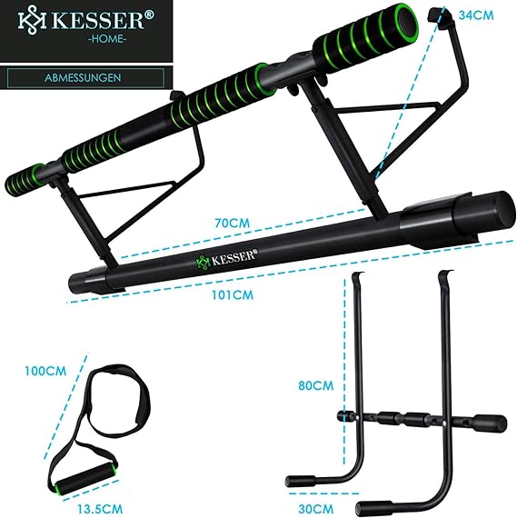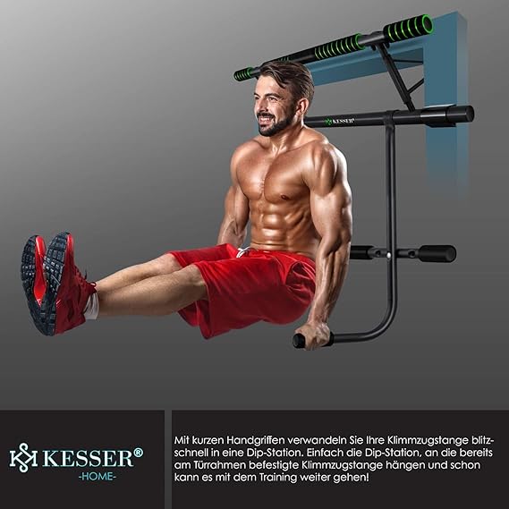 La barra per trazioni multifunzionale con stazione dip, funi elettriche non solo può essere montata su qualsiasi telaio della porta, ma potete anche attaccare barre dip parallele ad essa ed espandere le vostre opzioni di allenamento. Sia la barra per trazioni che la barra parallela offrono una capacità di carico fino a 130 kg. La barra superiore ha 4 impugnature in schiuma mentre la barra inferiore ha tappi in plastica per fissare la barra al telaio della porta. La barra per trazioni 4 in 1 sostituisce 4 diversi dispositivi. Dip stretti alla larghezza delle spalle allenano i tricipiti, trazioni Le trazioni per la parte superiore del corpo, sollevamento verticale della gamba è un esercizio per il basso addome, Flessioni Alzando e abbassando il corpo con le braccia, le flessioni allenano i muscoli pettorali, tricipiti e deltoidi anteriori - Poiché le maniglie possono essere ripiegate, è possibile riporre la barra per trazioni ovunque - nell'armadio, sotto il letto o in macchina. Extra: maniglie imbottite e protezioni per le porte regolabili per l'adattamento individuale alla vostra porta. Il tirante della porta di KESSER trasforma una porta in una palestra domestica. La nostra barra per trazioni è facile da montare e trasformerà il vostro soggiorno in una palestra domestica in pochi secondi. Basta agganciarla al telaio della porta e iniziare! Ottimale per l'allenamento di tutto il corpo - La barra per trazioni con una struttura estremamente stabile con rinforzi per un allenamento sicuro. Max. Capacità di carico 130 kg. Barra porta per aperture porte da 69 a 101 cm.