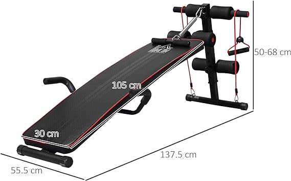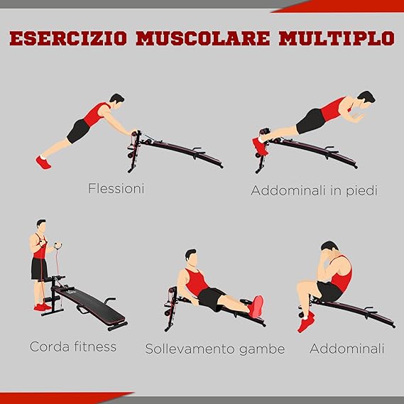 PANCA MULTIFUNZIONE: Questa panca per addominali può essere utilizzata per addominali, curl-up, sollevamenti delle gambe e flessioni e rendere più efficace il bodybuilding in casa e in ufficio. Due ganci sono inclusi per collegare due corde di tensione per aggiungere opzioni di allenamento. ALTEZZA REGOLABILE: Le cavigliere morbide regolabili della panca palestra su 5 livelli si adattano a diverse condizioni di altezza e forza. STRUTTURA IN ACCIAIO: La panca per esercizi è costituita da una struttura in acciaio e da una spessa spalliera imbottita, che può sostenere fino a 120 kg di peso. DESIGN PRATICO: Le pedane antiscivolo della panca multifunzione proteggono il pavimento, mentre i due manubri garantiscono la sicurezza durante l'allenamento. DIMENSIONI: Dimensioni complessive: 55.5L x 137.5P x 50-68A cm, Carico massimo: 120 kg. Ideale per allenare gambe, addominali e core.