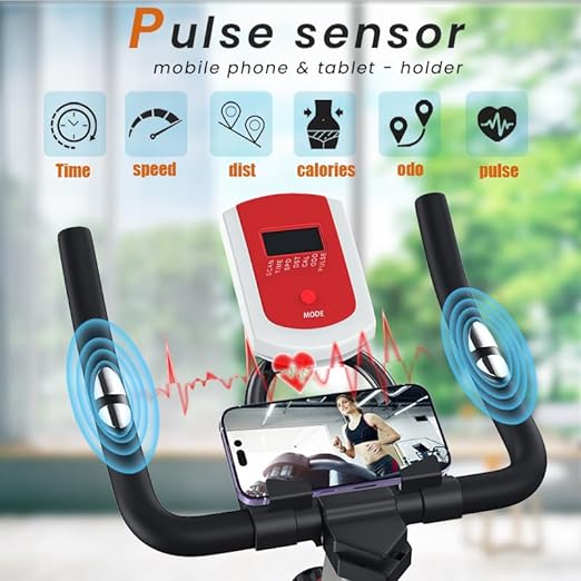 Morbida bicicletta da esercizio: la ruota d'inerzia e il robusto telaio in acciaio garantiscono la stabilità del dispositivo. Il sistema di allenamento permette di guidare in modo fluido e silenzioso, senza disturbare - Display LCD e supporto di fissaggio: lo schermo digitale multifunzionale consente di monitorare il tempo di esercizio, la velocità, le calorie bruciate, la distanza, ecc. Il supporto per cellulare consente di ospitare i dispositivi mobili in modo da non annoiarti durante l'esercizio. Diverse impostazioni in altezza: il sedile largo e il manubrio sono multiregolabili per utenti di diverse dimensioni. Puoi regolarlo in base alle tue esigenze per aumentare la rilevanza del movimento e fornire agli utenti un'esperienza confortevole di guida interna. Sicura da usare: la ruota di inerzia di alta qualità è frenata da una cinghia silenziosa e, secondo la struttura stabile del triangolo, può sopportare fino a 120 kg di utenti, e il pedale a gabbia può anche prevenire graffi nel movimento, rendendo il movimento più sicuro e stabile.