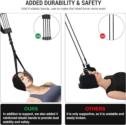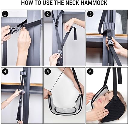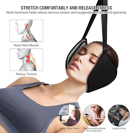 SOLLIEVO EFFICACE: Allungando delicatamente il collo, questa amaca a trazione cervicale rilassa i muscoli e favorisce la circolazione sanguigna, che riduce la compressione sulla colonna vertebrale e allevia l'affaticamento e il dolore al collo e alla testa. Perfetto per impiegati, studenti, autisti, atleti e persone che soffrono ancora di dolori al collo a causa di una cattiva postura o di uno stile di vita sedentario. NOTA: Questa è una terapia adiuvante o sollievo per le malattie delle vertebre cervicali ma non un trattamento specifico rapido. Basta usare questo dispositivo cervicale senza stress da 10 a 15 minuti al giorno e sentirai gradualmente un miglioramento nel tuo problema al collo. SICURO: Dotato di 4 forti corde elastiche, la nostra amaca per il collo gode di 4 volte più stabilità e resistenza alla trazione. Anche le fibbie e le cinghie sono molto più resistenti. Siate certi di appoggiare la testa su questa amaca da collo senza paura che la testa cada a terra! CONFORTEVOLE: Sentirai un grande relax e relax quando ti appoggi sul colletto del collo come su un cuscino. È realizzato in morbido velluto e tessuto a rete traspirante per un tocco confortevole ed è progettato ergonomicamente con imbottiture rimovibili per adattarsi meglio ai contorni del corpo. Inclusianche una mascherina per dormire e un paio di tappi per le orecchie per goderti un riposo più tranquillo.FACILE DA USARE: Basta agganciare e stringere la cinghia dell'amaca per il collo sulla maniglia della porta, gancio o ringhiera a diverse altezze usando la cinghia regolabile, è meglio mantenere la testa 5- 10 cm a terra. Il cuscinetto di trazione cervicale è impilabile e facile da riporre nella borsa in modo da poterlo portare e usarlo ovunque, soprattutto in viaggio.