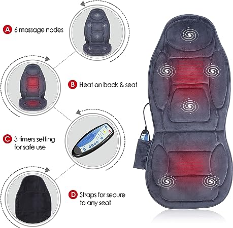 MASSAGGIO A VIBRAZIONE - Il sedia massaggiante con 6 motori a vibrazione fornisce un massaggio rilassante per tutto il corpo, alleviando lo stress, il dolore, la tensione ed eliminando la fatica. NOTA: Questo è solo un seduta massaggiante a vibrazione, non è un massaggiatore shiatsu con palline rotolanti. TERAPIA DI CALORE - Il cuscino sedile massaggiatore ha 4 cuscinetti riscaldanti per quattro zone di calore: schiena superiore, schiena bassa e cosce, 5 modalità di programma e 4 intensità di vibrazione variabili vi offrono il miglior massaggio personalizzabile, lenisce e rilassa i muscoli tesi e migliora il flusso sanguigno. TESSUTO IN FELPA SUPER MORBIDO - Il massaggiatore vibrante è fatto da 100% felpa super morbido, che offrono un sensazione piacevole e confortevole per il tocco del corpo; Il fondo in gomma fa il massaggiatore fissare in posizione. BUONO REGALO - Il massaggiatore elettrico ha un timer 15, 30 e 60 minuti