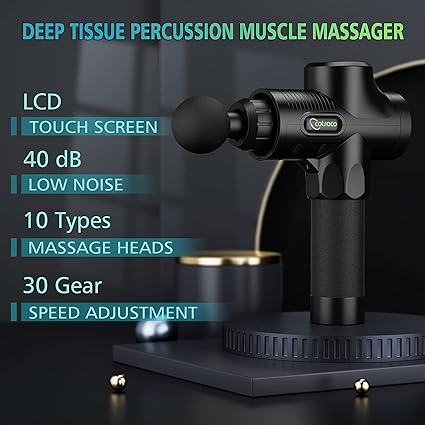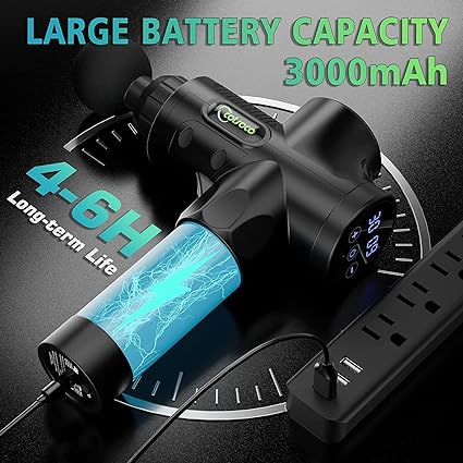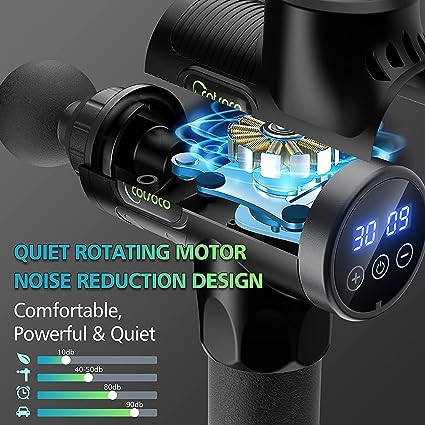 30 velocità regolabili e schermo LCD touch screencon un touch screen LCD facile da usare, la pistola per massaggio muscolare offre 30 diverse velocità regolabili e un massaggio rilassante per ogni necessità muscolare. Non solo aiuta i muscoli a rilassarsi dopo l'allenamento, ma può anche essere utilizzato per il massaggio quotidiano del corpo. - La Pistola massaggio può aiutare ad alleviare il dolore trasmettendo impulsi di pressione che penetrano in profondità nel tessuto muscolare, migliorando la libertà di movimento, flessibilità e circolazione sanguigna. La Pistola da Massaggio è Silenziosa: Con una tecnologia di riduzione del rumore di 35-45 dB e un motore ad alta coppia che può fornire una forte forza di massaggio che può raggiungere una profondità di 14 mm nelle parti morbide, allevia i dolori muscolari e rilassa il corpo. Si può utilizzare a casa, in palestra o in ufficio senza disturbare gli altri. Batteria migliorata con lunga durata: La Pistola per massaggio muscolare è dotata di una batteria al litio ricaricabile di alta qualità da 2600 mAh che garantisce un tempo di lavoro da 4 a 8 ore e richiede solo 3 o 4 ore per una ricarica completa. 10 testine massaggianti sostituibili:Con 10 testine massaggianti utilizzate su diverse parti del corpo, è possibile soddisfare le diverse esigenze di rilassamento muscolare. Dopo un lungo periodo di tempo seduti o esercizi faticosi, pistola massaggio elettrico rilassano e ringiovaniscono il corpo e offrono una fisioterapia rilassante. Tutto si inserisce in una pratica borsa per il trasporto, perfetta per i viaggi.