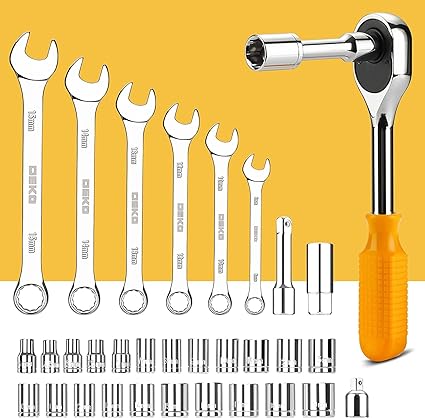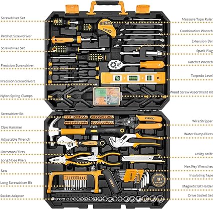 ALTA QUALITÀ E STANDARD: forgiato da acciaio di alta qualità e rifinito in cromo lucido, resistenza, durata, protezione anticorrosione. Tutti gli strumenti soddisfano o superano gli standard ANSI critici VARIETA 'COMPLETE: contiene gli strumenti necessari per la maggior parte delle piccole riparazioni e progetti base fai-da-te intorno alla casa. Perfetto per tuttofare, riparatori, operai edili, meccanici, carrozzerie ecc. Anche un grande set di strumenti per avere a casa, garage e l'officina INCLUDE: assortimento completo di chiavi dinamometriche professionali, cricchetti, una gamma completa di prese da 1/4 pollici e 3/8 pollici di dimensioni metriche e cacciavite di precisione, martello, metro a nastro, pinze, chiave inglese, ecc. Il cricchetto a 72 denti è facilmente Sposta per cambiare direzione premendo un interruttore a 5 gradi. Varietà di punte per cacciaviti da 1/4 di pollice: Phillips, a taglio, quadrato, a stella e pozi. Include anche impugnatura morbida su cacciavite, pinz FACILITÀ DI TRASPORTO E STOCCAGGIO: alloggiati in una pratica custodia soffiata per una facile conservazione degli attrezzi e portabilità . Il suo robusto interno e l'organizer mantiene gli attrezzi in posizione DESIGN DI GRANDE ORGINALITÀ: Custodia nera lo rende resistente allo sporco. Il design a forma di cuore lo rende unico e alla moda. Dimensioni del collo ‎44 x 34,66 x 9,2 cm; 6,12 Kg