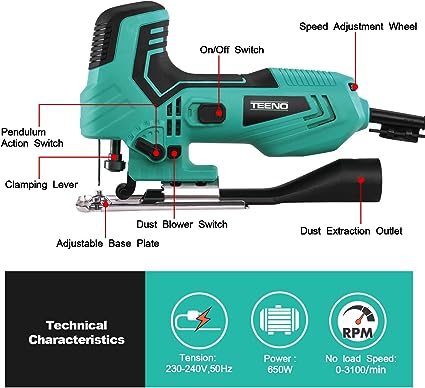 Il seghetto elettrico da 650 W offre eccellenti prestazioni di taglio con una velocità di 3000 volte/min. Il seghetto alternativo con 6 velocità regolabili può tagliare facilmente diversi materiali. 4 Orbite Variabili: Coltello di sollevamento file 0-3, adatto a diversi materiali da taglio: maggiore è la velocità, maggiore è la velocità di taglio, adatto per materiali morbidi, minore è la velocità, maggiore è la velocità di taglio. il taglio è lento, più adatto per materiali duri.(Quando si tagliano materiali metallici, si consiglia di impostare su 0, quindi utilizzare una lama per seghetto per tagliare il metallo) - Taglio smussato preciso a 45 gradi: L'angolo di taglio massimo regolabile del seghetto è compreso tra -45 e 45 gradi per i tagli smussati, puoi scegliere un buon angolo in base alle esigenze di taglio come tagli tangenti, smussati o curvi. La profondità di taglio massima è di 65 mm per il legno, 6 mm per la plastica e 6 mm per il metallo. Lama a cambio rapido con pulsante di blocco: Sostituzione facile e rapida della lama in pochi secondi senza attrezzi, il seghetto alternativo è dotato di un interruttore di blocco per aumentare il comfort e ridurre l'affaticamento durante le lunghe sessioni di taglio. Lavorando in un ambiente buio, è possibile accendere la luce della macchina.Contenuto della confezione - 1x seghetto elettrico, 5 * lame (legno * 3, PVC * 1, metallo * 1), 1 * connettore di aspirazione della polvere, 1 * chiave inglese, 1 * spazzola di carbone, 1 * manuale di istruzioni.