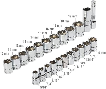CONTENUTO - 1 x barra estensibile 3'', 1 x bussola per candele 5/8'', 1 x cricchetto 3/8'';10 x chiavi a bussola in pollici 5/16